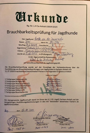 Den "Leistungsnachweis am Schwarzwild" hat Elsa im Januar 2024 erbracht.