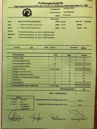 Nach einer erfolgreichen EPB im Herbst 2025 sammelt Grille erste Erfahrungen: Sie hat den Härtenachweis abgelegt und jagt ordentlich an Sauen, ganz wie ihre Mutter Vera vom Wildererstein und ihre Schwester Elsa von der Donareiche.